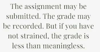 Artificial Intelligence is a powerful tool. (AI is checking my grammar and spelling as I write this now). Used wisely, it'll be a real blessing. But when it replaces your own thinking, it removes the resistance your mind needs to grow. This is how you grow into someone who can use these tools well. The assignment may be submitted. The grade may be recorded. But if you have not strained, the grade is less than meaningless. Always remember, the grade is not the point.