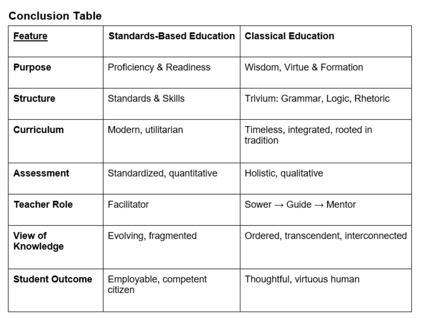 Standards-based education, which most of us grew up with, is rooted in progressivism and behaviorism. It focuses on measurable outcomes, state benchmarks, and career readiness. It aims to produce competent students who meet standards.
